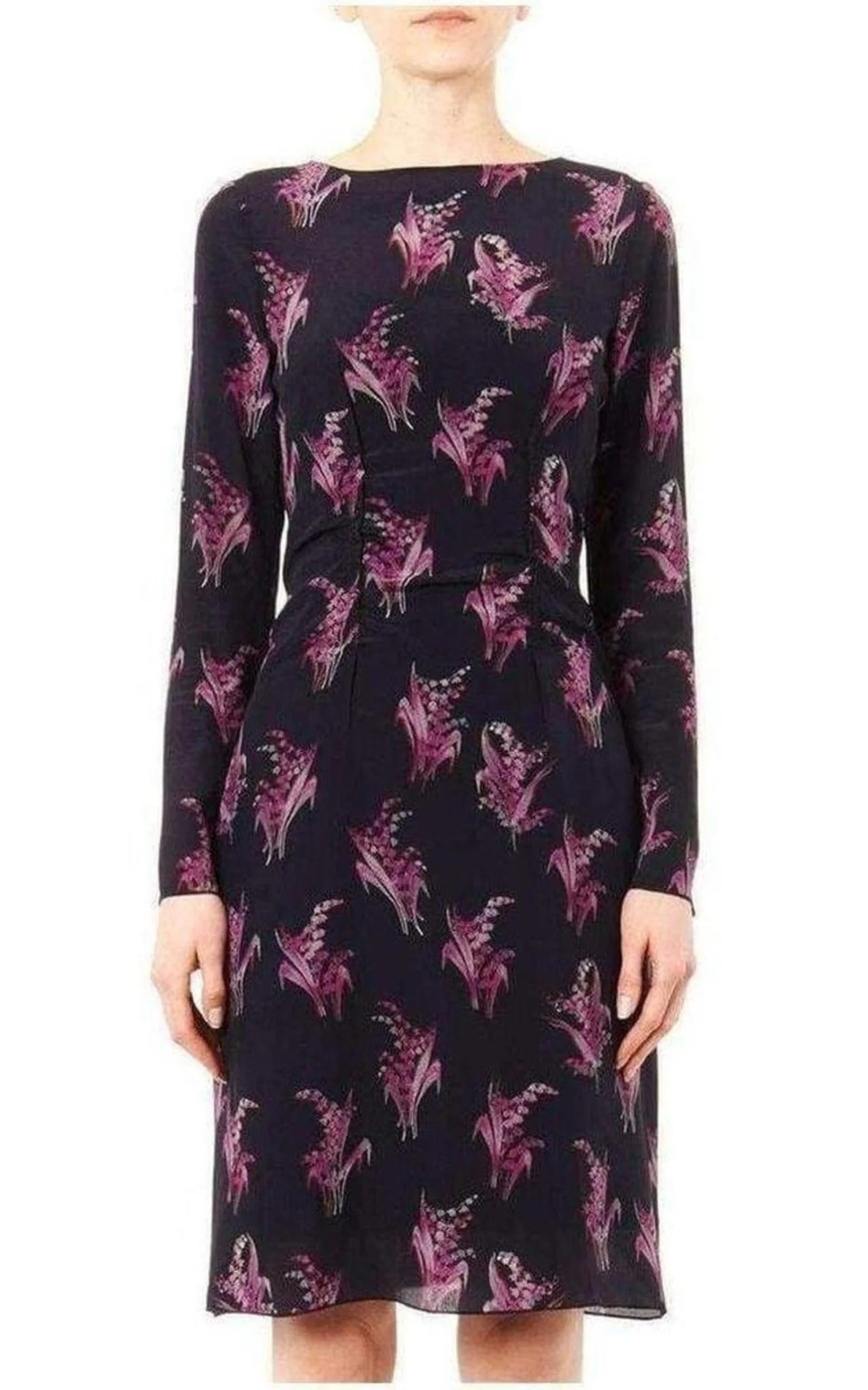 This beautiful dress is made entirely from silk and decorated all over with fuchsia blooms.