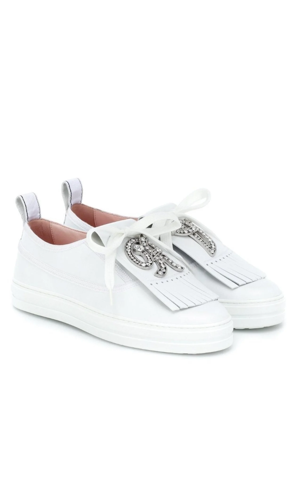RV Jewel leather sneakers by Roger Vivier, featuring removable fringed patch with jewel monogram in silver-tone metal and crystals.