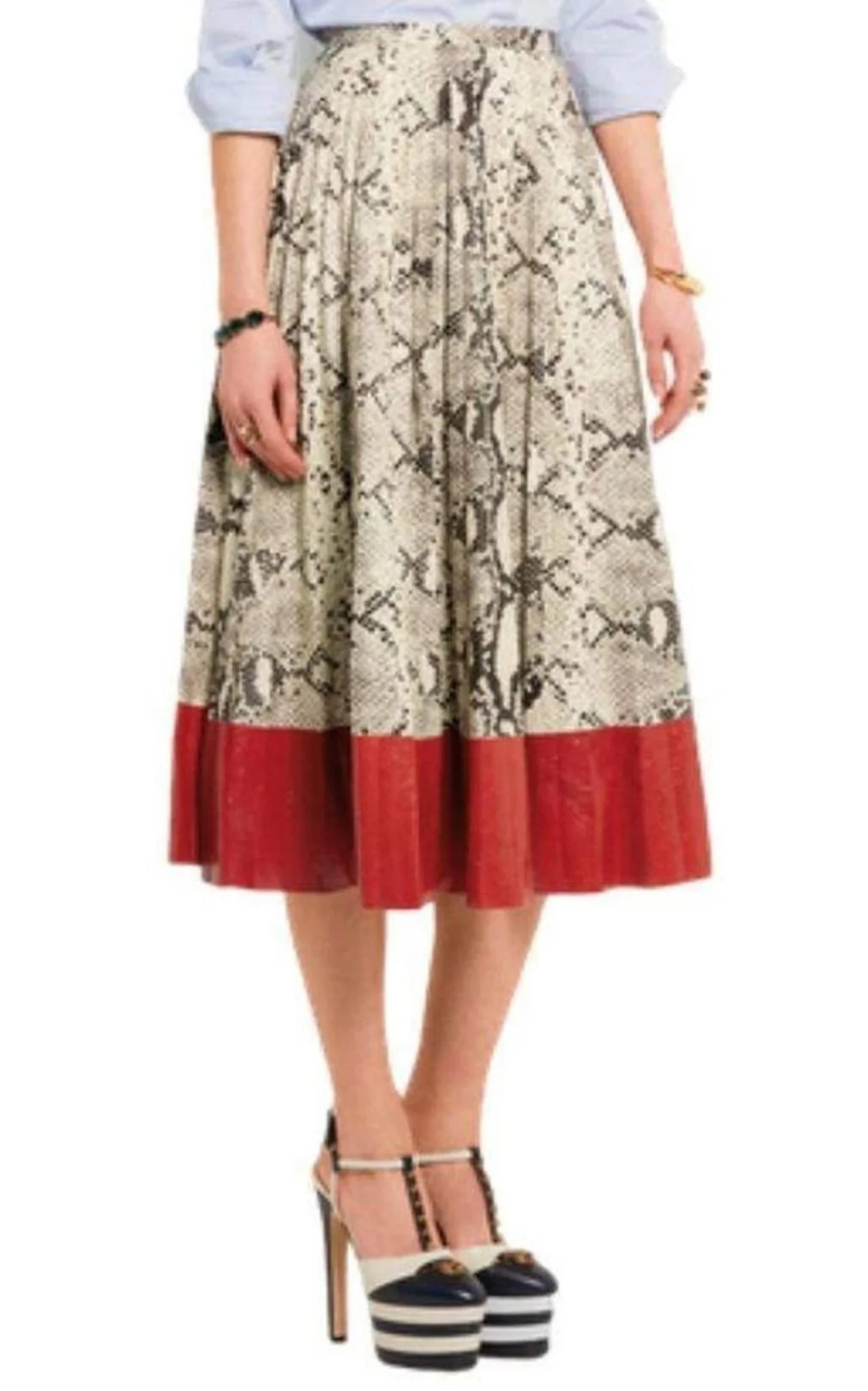 This pleated midi skirt is expertly crafted from tonal-gray and red snake-effect leather with a silk-crepe lining.