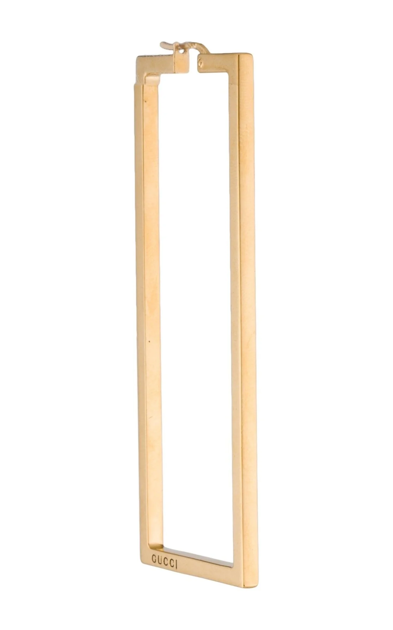 The rectangle earring is crafted from brass in a polished gold-tone finish, featuring a geometric silhouette and logo engraving